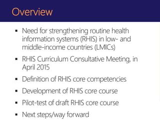 This document summarizes the development of a standardized Routine Health Information System (RHIS) curriculum. It describes the need to strengthen RHIS in low and middle-income countries. A consultative meeting in 2015 defined RHIS core competencies and developed a core RHIS course. This was then pilot tested in India in 2016. The finalized curriculum covers 10 modules on topics like data collection, management, analysis and use. Next steps include disseminating the curriculum through training workshops to strengthen RHIS globally.