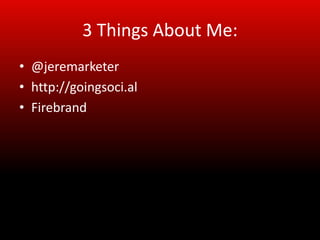 The document discusses how social media can be used across different departments in an organization. It provides examples of how marketing, product development, sales, PR, finance, HR, IT, and competitive analysis departments can leverage social platforms like Facebook, LinkedIn, Twitter, Instagram, and others. The key message is that social media is relevant for all departments and organizations need to embed it throughout their operations rather than viewing it as just a marketing channel.