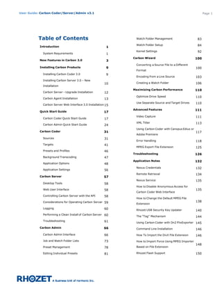 This document is a user guide for the Rhozet Carbon Coder/Server/Admin v3.1 software. It introduces new features in Carbon 3.0 like 8/16 channel audio support, expanded input control for certain file formats, and macro-gridding technology. The guide provides instructions for installing Carbon products and using features in the Carbon Coder, Carbon Server, and new Carbon Admin application. It also covers troubleshooting and contains a glossary and index.