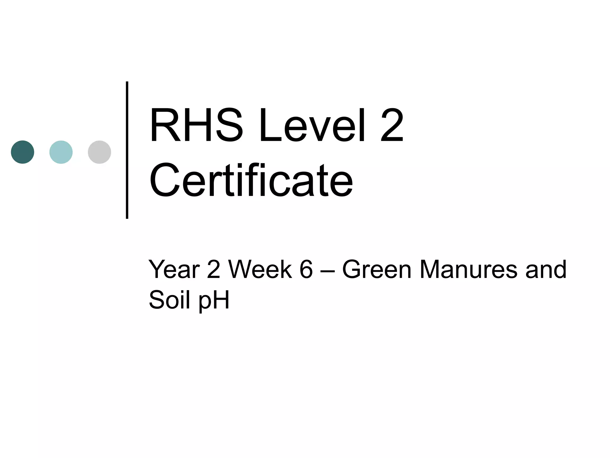 Soil pH indicates acidity or alkalinity on a scale of 1-14. Plants generally grow best between 6.5-7.5. Soil pH affects nutrient availability and plant selection. Lime can raise pH while sulfur and acidic compost can lower it. pH impacts whether plants receive enough nutrients like calcium and iron.