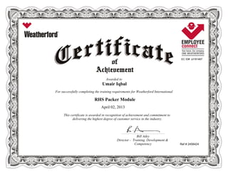 Umair Iqbal completed training requirements for Weatherford International's RHS Packer Module on April 02, 2013. This certificate recognizes his achievement and commitment to providing excellent customer service. It was issued by Bill Adey, Director of Training, Development, and Competency at Weatherford International.