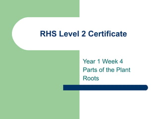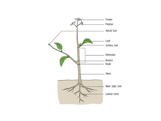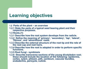 This document discusses the parts of plants, focusing on roots. It defines different types of roots including primary, secondary, tap, lateral, fibrous, and adventitious roots. The structure of roots is described, including the radicle, root cap, root hairs, cortex, pericycle, and tissues within the root like epidermis, endodermis, xylem and phloem. Roots are adapted to absorb water and nutrients from soil, provide anchorage, and store food. Some plants form symbiotic relationships with nitrogen-fixing bacteria or mycorrhizal fungi. The learning objectives cover identifying plant parts, root development and structure, adaptations, and symbiosis.