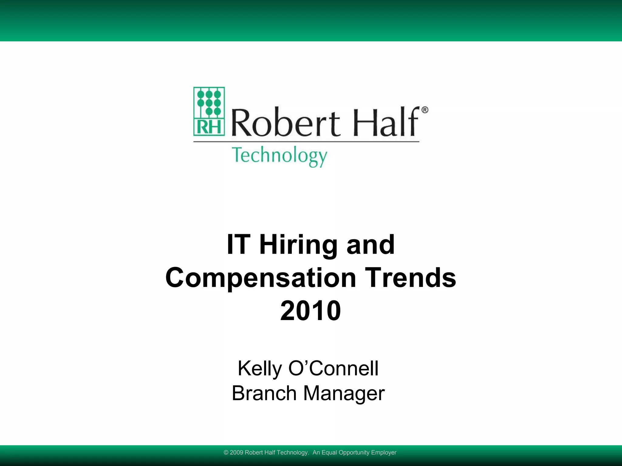 The document presents an overview of IT hiring and compensation trends for 2010, highlighting the challenges in recruiting qualified IT professionals amidst economic uncertainties. It reveals a continued demand for specialized technical skills and provides salary ranges for various IT positions, showing an average expected salary decrease of 1.3%. Additionally, it emphasizes the importance of soft skills and certifications while advocating for flexible staffing solutions to maintain productivity during economic downturns.
