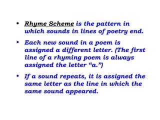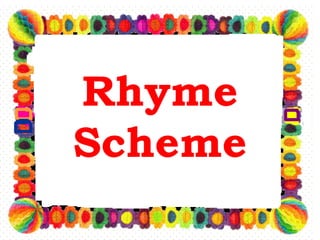 The document provides information about rhyme schemes in poetry. It explains that rhyme scheme refers to the pattern of rhyming sounds at the ends of lines. Each new rhyming sound is assigned a letter, with the first line of a poem being "a". If a sound repeats, it is given the same letter. The rhyme scheme continues through the entire poem, not restarting in each stanza. Examples of rhyme schemes are then provided for several poems.