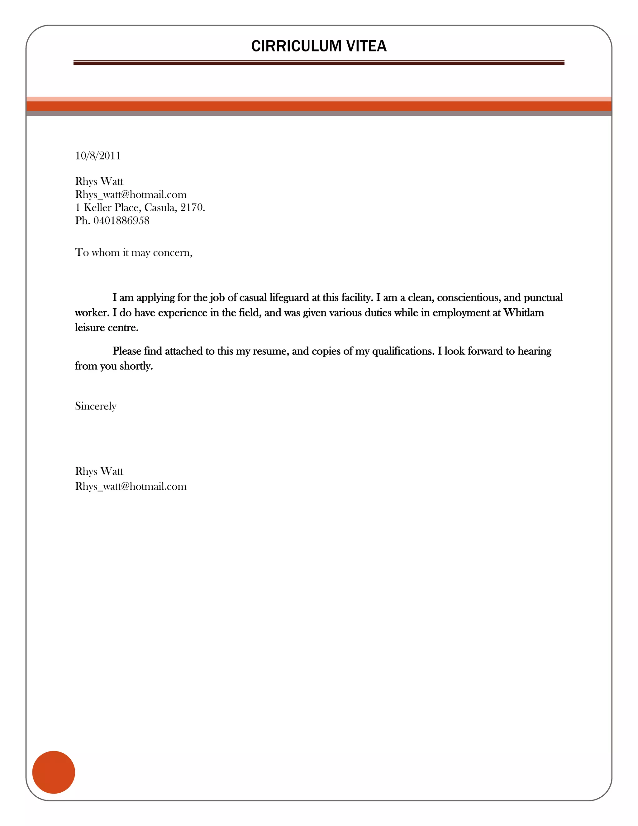 Rhys Watt is applying for a position as a casual lifeguard. He has previous experience as a lifeguard at Whitlam Leisure Centre where he performed duties like pool water testing and supervising patrons. He has the relevant qualifications like a Senior First Aid certificate and Bronze Medallion. He believes he would be a good fit for the role as he is a conscientious worker and current university student.