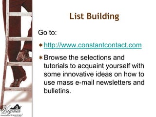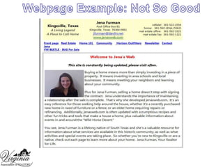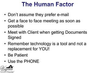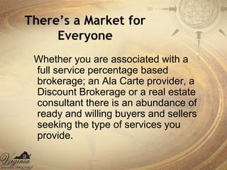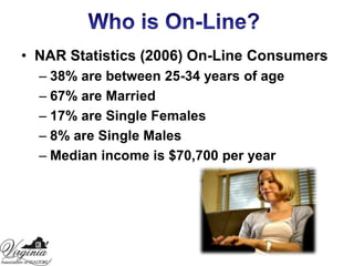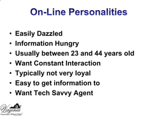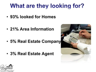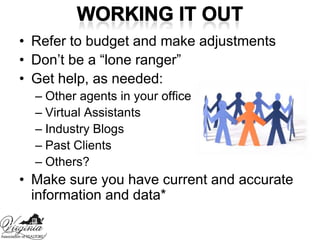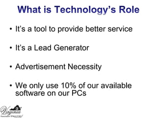 This document discusses personal promotion strategies for real estate agents. It provides statistics on home buyer and seller preferences and how clients choose agents. The document then outlines sections on learning promotion and marketing budgets, developing a personal promotion plan, selecting a niche market, and using technology and photography in promotion. Key points include investing 15-20% of gross income in promotion, developing a unique selling position, and using color photography in direct mail and email marketing.