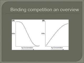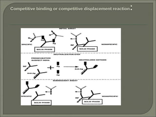 Radioimmunoassay (RIA) is an in vitro assay that uses radioisotopes conjugated to antigens or antibodies to detect antigen-antibody complexes with high sensitivity. RIA involves an antigen-antibody immune reaction, competitive binding between labeled and unlabeled antigens for antibodies, and measurement of radio emissions. The amount of unlabeled antigen in a sample can be determined based on the amount of labeled antigen displaced from antibodies. RIA allows for quantification of very small quantities of antigens and antibodies and is used to analyze concentrations of hormones, drugs, and viral antigens in biological fluids.