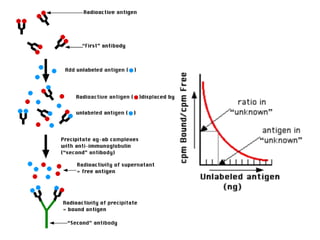 Radioimmunoassay (RIA) is an in vitro assay technique introduced in 1960 that uses antibodies to very sensitively measure antigen concentrations. It involves the separation of a protein from a mixture using the specificity of antibody-antigen binding, followed by quantitation using radioactivity. RIA utilizes competitive binding reactions and the measurement of radio emissions. Immunofluorescence also uses fluorescent-labeled antibodies but to detect specific target antigens. It emits greenish fluorescence under UV light that can be viewed under a fluorescence microscope. Both techniques have various medical applications like cancer detection, drug screening, and research.