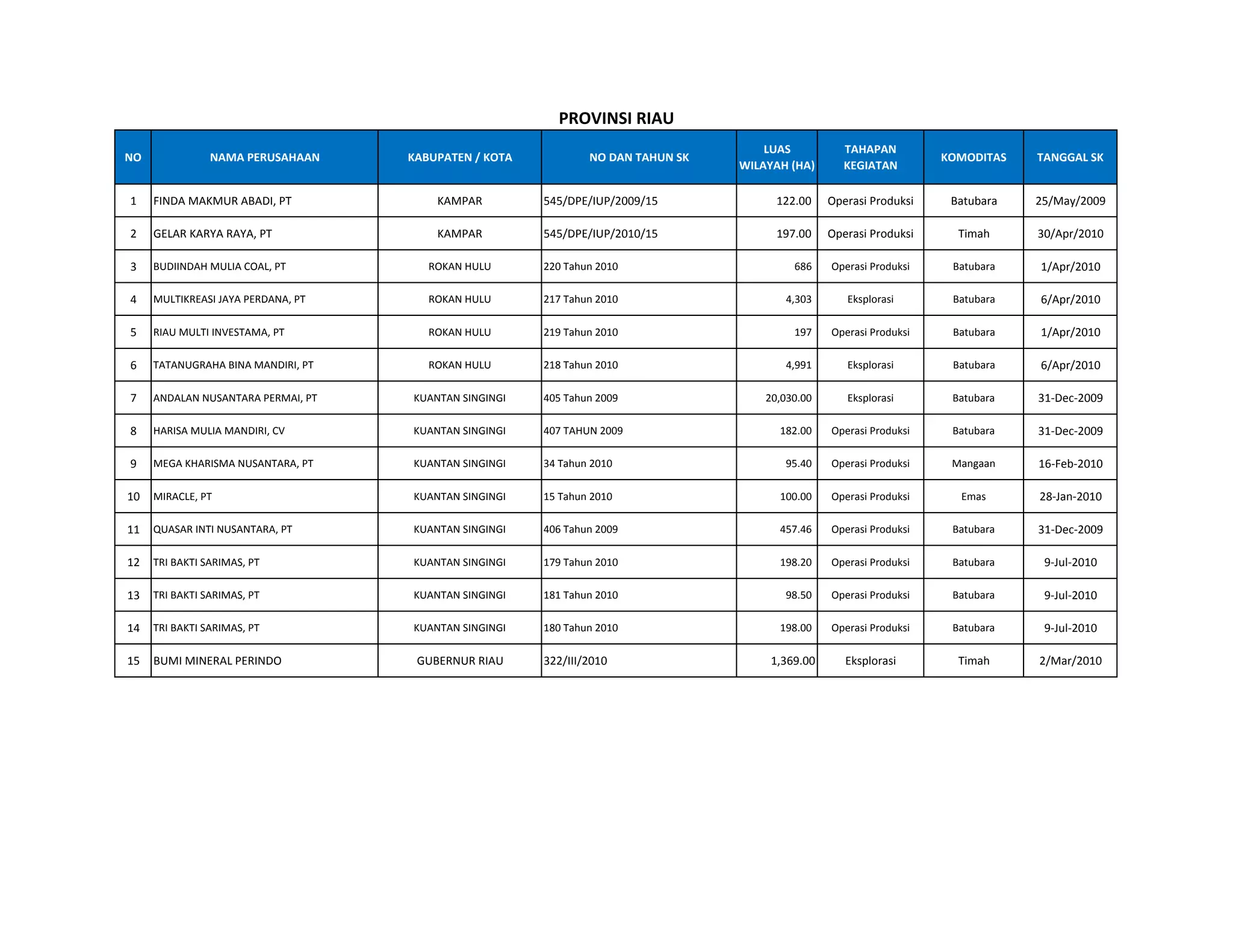 4 MULTIKREASI JAYA PERDANA, PT ROKAN HULU 217 Tahun 2010 4,303 Eksplorasi Batubara 6/Apr/2010