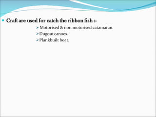 Ribbon fish, also known as hair-tail or cutlass fish, are an important bycatch species in Indian fisheries. They have an elongated, ribbon-like body and belong to the family Trichiuridae. The four commercially important species in India are Trichiurus lepturus, Eupleurogrammus intermedius, Lepturacanthus savala, and E. muticus. Ribbon fish are carnivorous predators found in marine and estuarine waters along the Indian coasts. Their spawning occurs seasonally from April-June or November-December. Landings of ribbon fish in India have increased over time, with the highest recorded landings of 197,000 tonnes