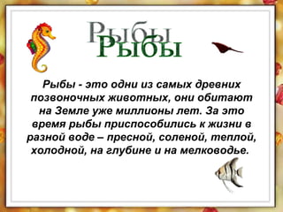 Документ содержит удивительные факты о различных видах рыб, описывая их уникальные особенности и адаптации к среде обитания. В нем упоминаются такие рыбы, как белая акула, электрический угорь и китовая акула, включая информацию о их размерах, поведении и характеристиках. В итоге, документ предоставляет комплексную информацию о разнообразии рыб и их уникальных способностях.
