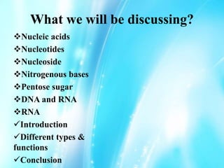 Nucleic acids are polymers of nucleotides that include DNA and RNA, which are found in living systems. RNA is one of the major biological macromolecules essential for life, along with DNA and proteins. There are different types of RNA including mRNA, tRNA, and rRNA that have primary functions like translation, protein synthesis, and mRNA processing. RNA can also carry genetic information like DNA and some viruses have RNA genomes.