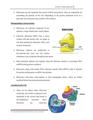 This document discusses the structure, composition, and assembly of ribosomes. It provides details on both prokaryotic and eukaryotic ribosomes. Some key points include:
