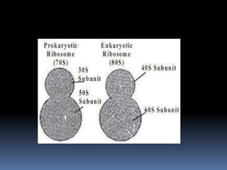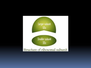 Ribosomes are large complex molecules found in all living cells that are the site of biological protein synthesis. They consist of two subunits that come together during protein translation. Ribosomes along with transfer RNA (tRNA) help translate protein-coding genes in messenger RNA (mRNA) into proteins. The process of protein synthesis begins with transcription of DNA to mRNA, which is then translated into proteins with the help of ribosomes and tRNA. Translation occurs as the ribosome moves along the mRNA, facilitating the binding of tRNA to the mRNA and the formation of peptide bonds between amino acids, eventually resulting in a completed protein chain.