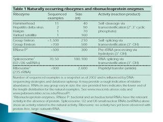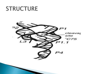 This document discusses various types of ribozymes, which are catalytic RNA molecules. It describes several naturally occurring ribozymes including hammerhead ribozymes, hairpin ribozymes, hepatitis delta virus ribozyme, and the ribosomal RNA. Ribozymes are able to catalyze chemical reactions without protein enzymes. The document also discusses the potential applications of artificial ribozymes in gene therapy and treatment of diseases.