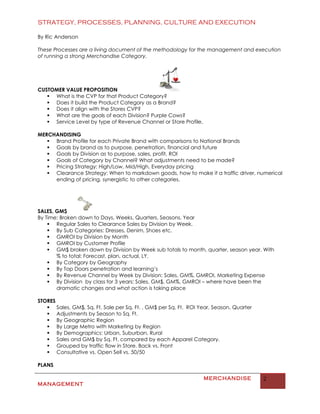 The document provides a comprehensive framework for merchandise management. It outlines key areas of focus including customer value proposition, merchandising, sales and gross margin analytics, store performance, planning, culture, analysis, merchandise processes, inventory reviews, marketing, communication, employee recognition, vendor seminars, retail store analysis, and questions to ask. The level of detail in each section demonstrates an emphasis on data-driven decision making and continuous improvement of merchandise strategy, processes, and execution.