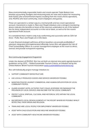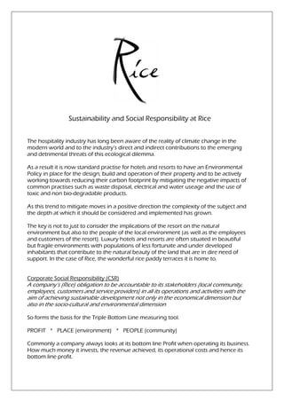 The document discusses sustainability and social responsibility initiatives at Rice resort. It explains that as awareness of climate change has grown, it is now standard for hotels to have environmental policies and work to reduce their carbon footprint. However, sustainability also requires considering the local community and employees. Rice has therefore established a triple bottom line approach to ensure it is profitable while also supporting the environment and people. Key programs outlined include engaging the local community through infrastructure support, hiring local staff, and assisting with education, healthcare and cultural preservation.