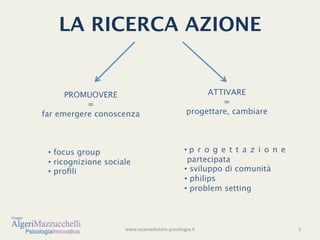 Il documento tratta della ricerca-azione, un approccio che promuove la co-generazione di conoscenza tra partecipanti e ricercatore per affrontare problemi della vita reale e migliorare l'empowerment della comunità. Il ciclo di ricerca-azione include identificazione del problema, raccolta e analisi dei dati e sviluppo di soluzioni, evidenziando la connessione tra azione e conoscenza. Le teorie di Lewin indicano un approccio dialettico e circolare, in cui il cambiamento è sia un obiettivo che un risultato dell'apprendimento attivo.