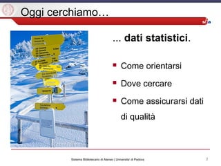 Il documento fornisce indicazioni sulla ricerca e valutazione della qualità dei dati statistici disponibili nel web, delineando criteri di qualità come trasparenza e accuratezza. Viene descritto il ruolo delle biblioteche nella selezione e conservazione di fonti informative di qualità, nonché una panoramica delle fonti statistiche italiane e internazionali. Infine, si evidenziano le principali istituzioni e strumenti per accedere a dati statistici ufficiali in Italia e a livello globale.