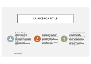 La ricerca utile in ambito clinico si concentra sull'efficacia, la prevenzione e la diagnosi di malattie, e sulla sua applicabilità nella pratica professionale. Essa richiede studi di alta qualità, tra cui sperimentazioni controllate randomizzate e studi osservazionali, per produrre evidenze clinicamente significative e generalizzabili. Inoltre, deve considerare le priorità dei pazienti e il rapporto costo/efficacia, garantendo che i risultati siano rilevanti e facilmente accessibili.
