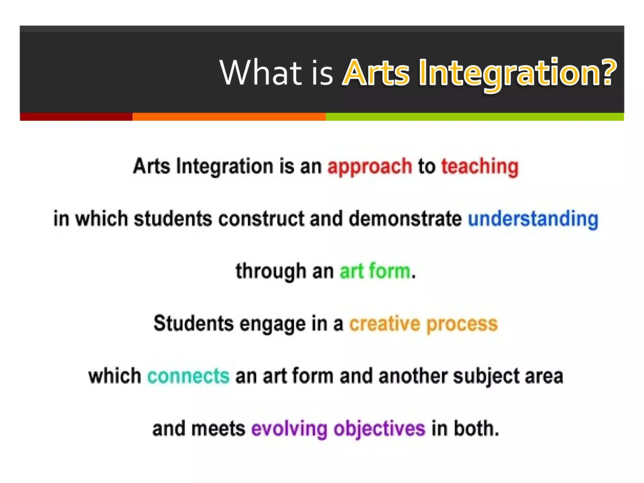 #14 Lisa 9:00 Intent: Explain what arts integration is… Talking points: Arts integration as defined by the Kennedy Center. What is it? This does NOT mean you are expected to master the art of teaching the arts. You won’t be teaching how to do a plie, use charcoal to sketch a replica of the Statue of David, or even sing holiday songs on key while playing the piano. Let’s see some examples of arts integration so we better understand what it is…