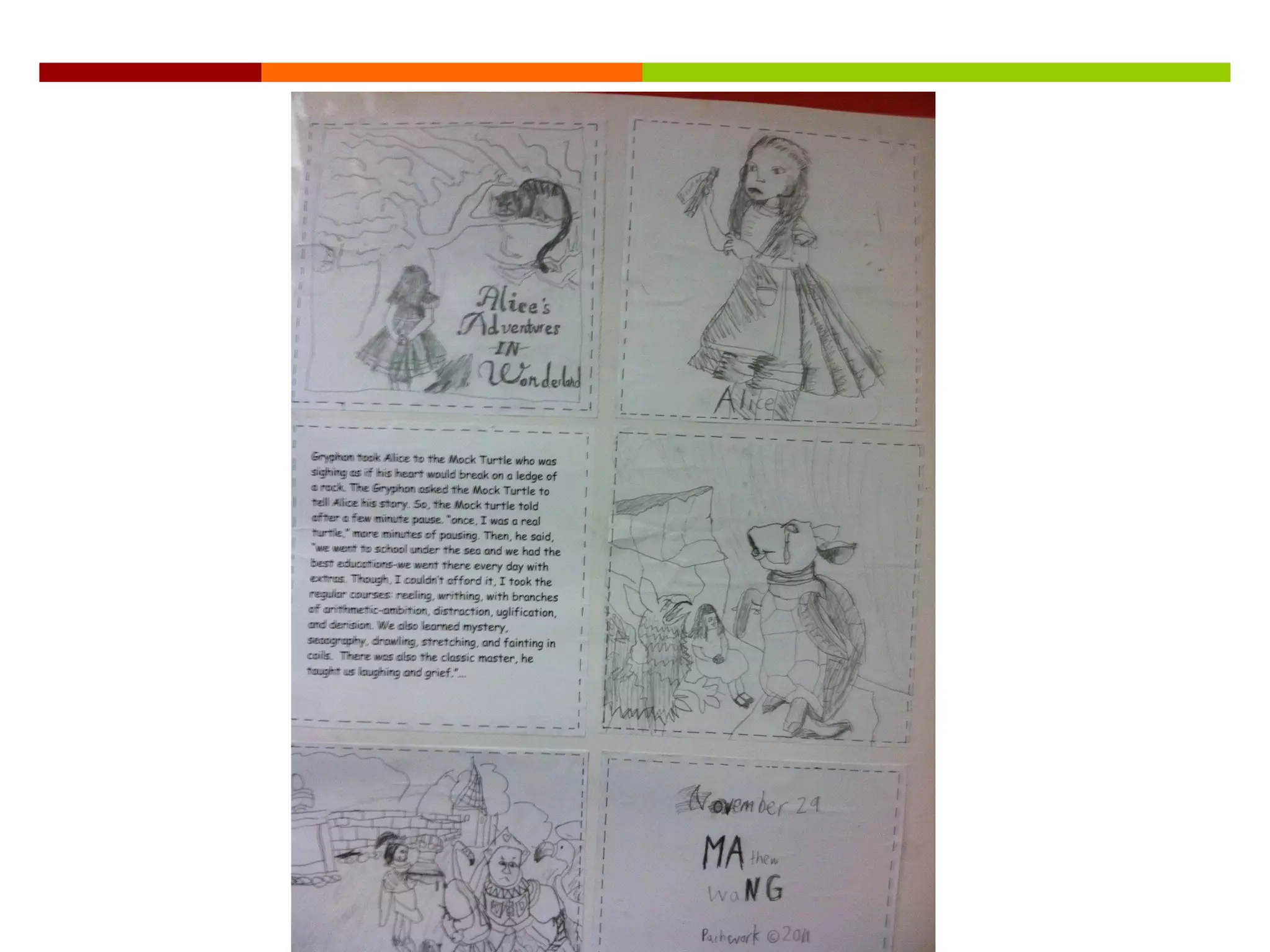 #17 Talking points: Here a 4 th grade book report that incorporates freehand drawing, use of color/shading (visual arts standards) in this example of Alice’s Adventure in Wonderland