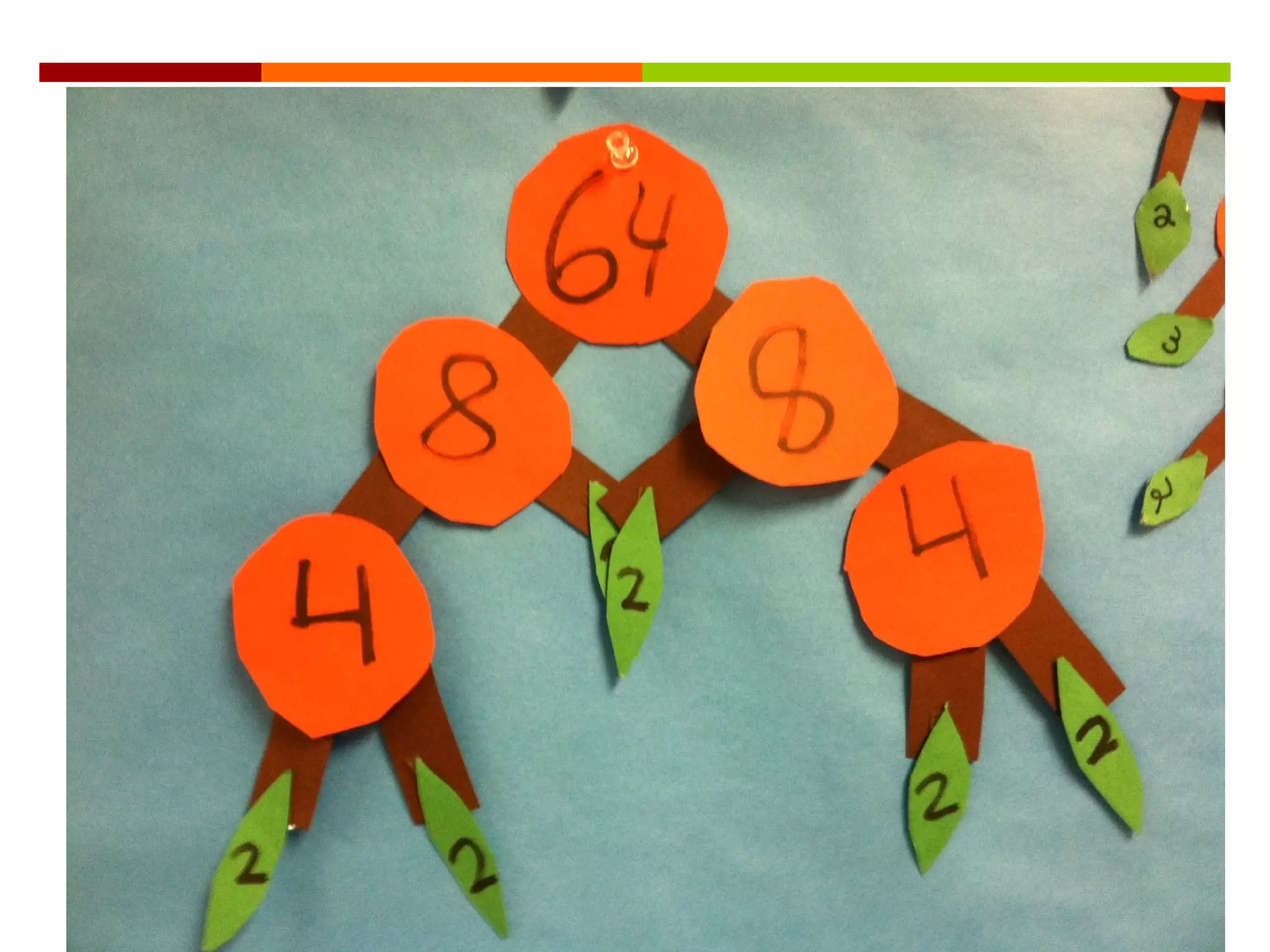 #19 Talking points: Here a 4 th grade example of prime factoring adding artwork in the form of a cherry tree – with the red cherries as the numbers to be reduced and the green sections being the prime numbers.