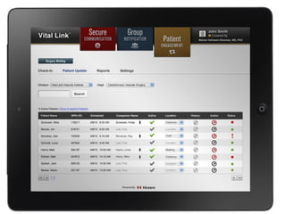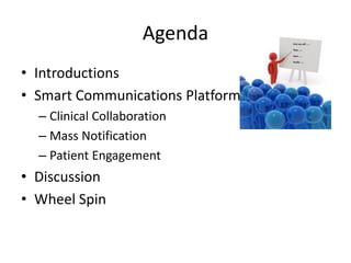 The document discusses a smart communications platform that provides clinical collaboration, mass notification, and patient engagement capabilities. It allows secure messaging between staff via smartphones, browsers, and nurse call systems. It can also send emergency notifications, medication reminders, and wayfinding directions to patients. The platform integrates with EHR systems and aims to reduce missed appointments, improve patient experience and optimize staff utilization.
