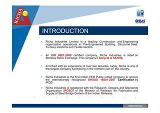 Richa Industries Limited is a leading construction and engineering organization in India operating in pre-engineered buildings, structural steel, textiles, and turnkey solutions. It has over two decades of experience and manufacturing facilities in Kashipur and Kanwara. The company provides design, manufacturing, and construction services for pre-engineered buildings, structural steel projects, and full turnkey solutions. It has completed hundreds of projects across various sectors.