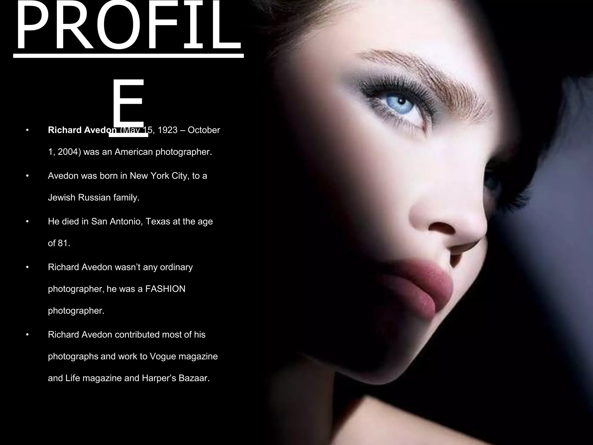 Richard Avedon was an American fashion photographer born in New York City in 1923 to a Russian Jewish family. He made significant contributions to Vogue, Life, and Harper's Bazaar magazines through his fashion and portrait photography. Avedon helped define fashion photography and is renowned for his portraits of celebrities, world leaders, and cultural figures. He died of a brain hemorrhage in 2004 while working on an assignment in Texas at the age of 81.