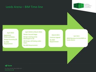BIM was trialled on the Leeds Arena project starting in April 2011 when BAM decided to use it. The key benefits included: