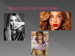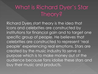 Richard Dyer's star theory argues that celebrities are constructed by media institutions for financial gain by representing 'real people' to appeal to target audiences. Stars are modeled around audiences to increase sales. Beyoncé is discussed as both supporting this theory through her transformation over time and trends, while also challenging it by leaving a cultural legacy through her charity work, which Dyer argues makes her a 'true pop star'. However, there is debate around whether Beyoncé is a positive role model or promotes negative behaviors.