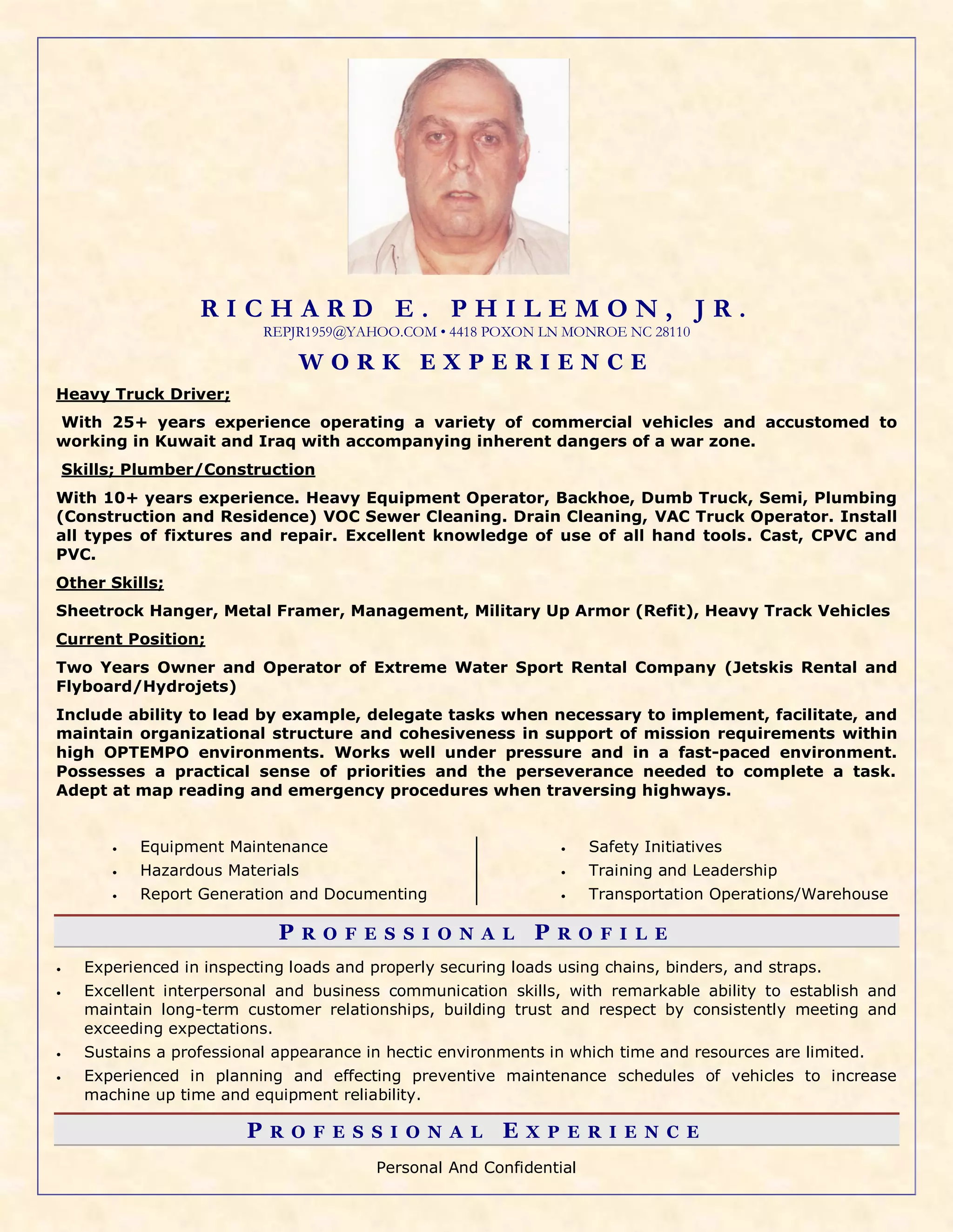 Richard E. Philemon Jr. has over 25 years of experience as a heavy truck driver, operating vehicles in Kuwait and Iraq. He also has 10+ years of experience in plumbing, construction, and operating heavy equipment. Currently, he owns and operates an extreme water sport rental company. He is skilled in equipment maintenance, hazardous materials, safety initiatives, training, and transportation operations.