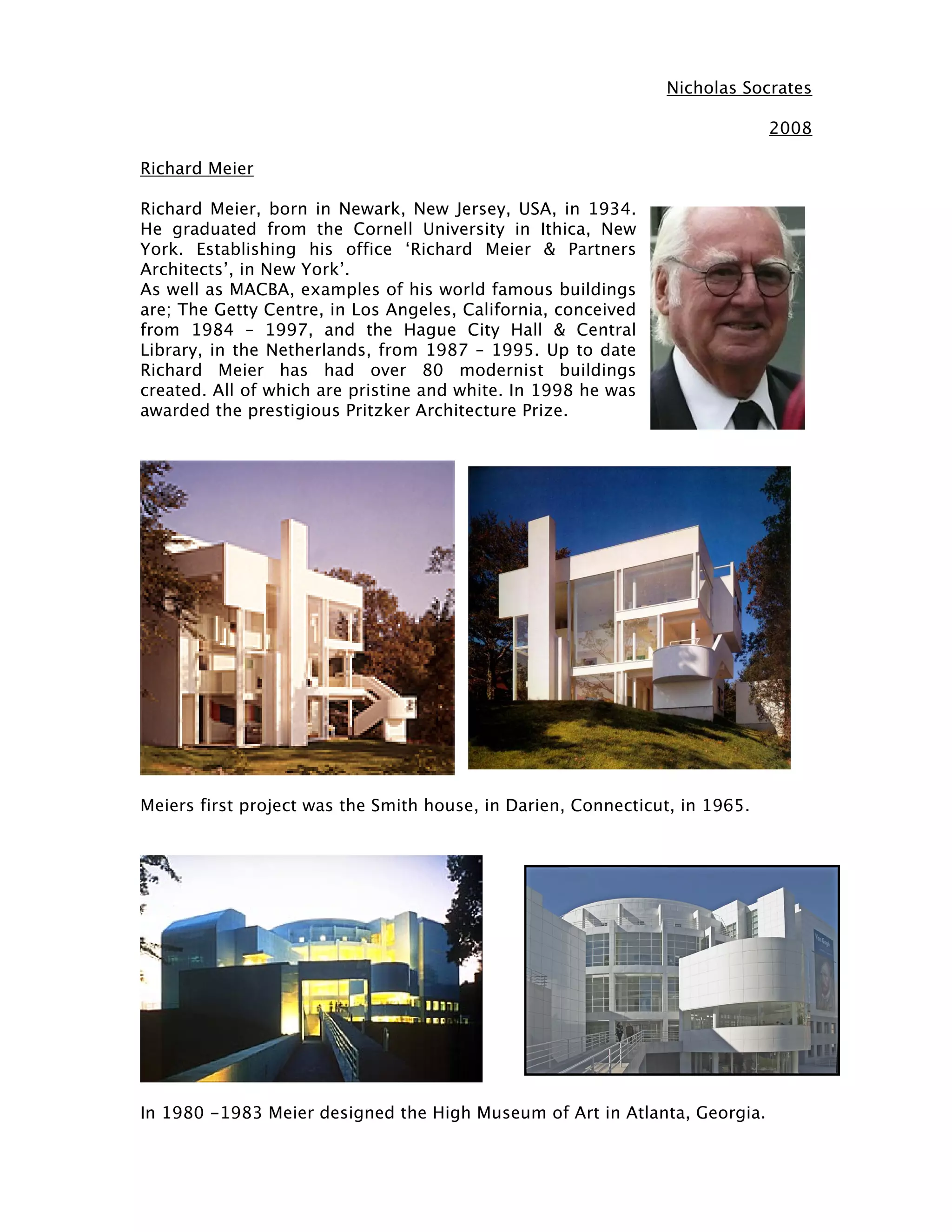 Richard Meier is an American architect born in 1934 known for his modernist and minimalist buildings constructed primarily of white surfaces. Some of his most famous works include the Getty Center in Los Angeles, the High Museum of Art in Atlanta, and the Hague City Hall and Central Library in the Netherlands. Meier's first project was the Smith House in 1965 and he was awarded the prestigious Pritzker Architecture Prize in 1984. His architecture is characterized by an emphasis on light, space, and the use of whiteness in his designs.