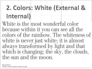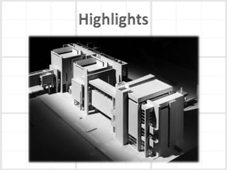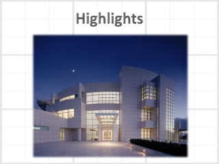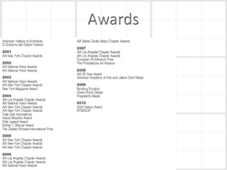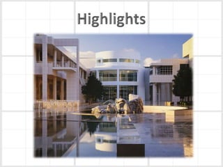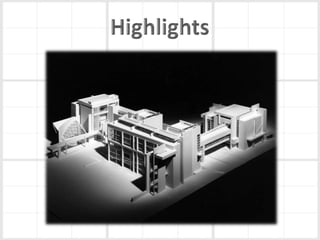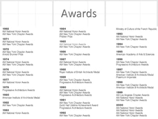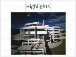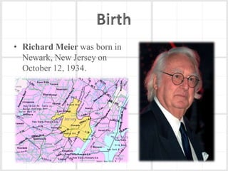 Richard Meier is an American architect born in 1934 in New Jersey. He earned his architecture degree from Cornell in 1957. Some of his notable early works include a house for his parents in 1965 and the Smith House in 1967. He began designing larger projects in the 1970s, like the Bronx Developmental Center. Meier received the Pritzker Prize in 1984 for his contributions to architecture. His most famous work is the Getty Center in Los Angeles, which took 13 years to complete. Meier's architecture is characterized by its use of form, light, and materials like concrete and glass. He continues to design projects around the world today.