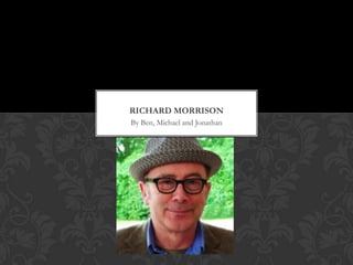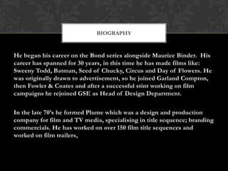 Richard Morrison is a film designer with a 30-year career, known for his work on title sequences for films like Sweeney Todd and Circus. He has created over 150 title sequences, often using thematic elements and music to enhance the storytelling. Morrison emphasizes the creative potential for future designers in exploring the moving image.