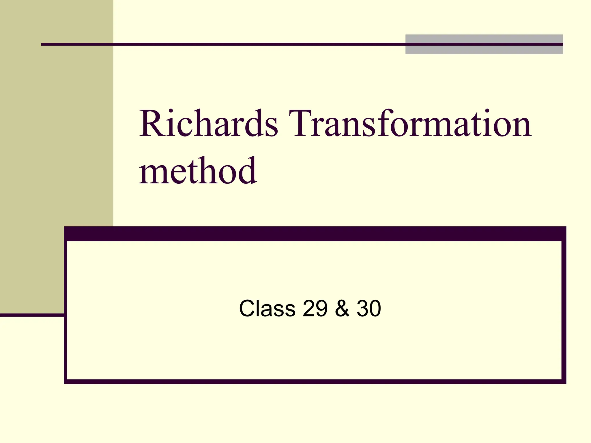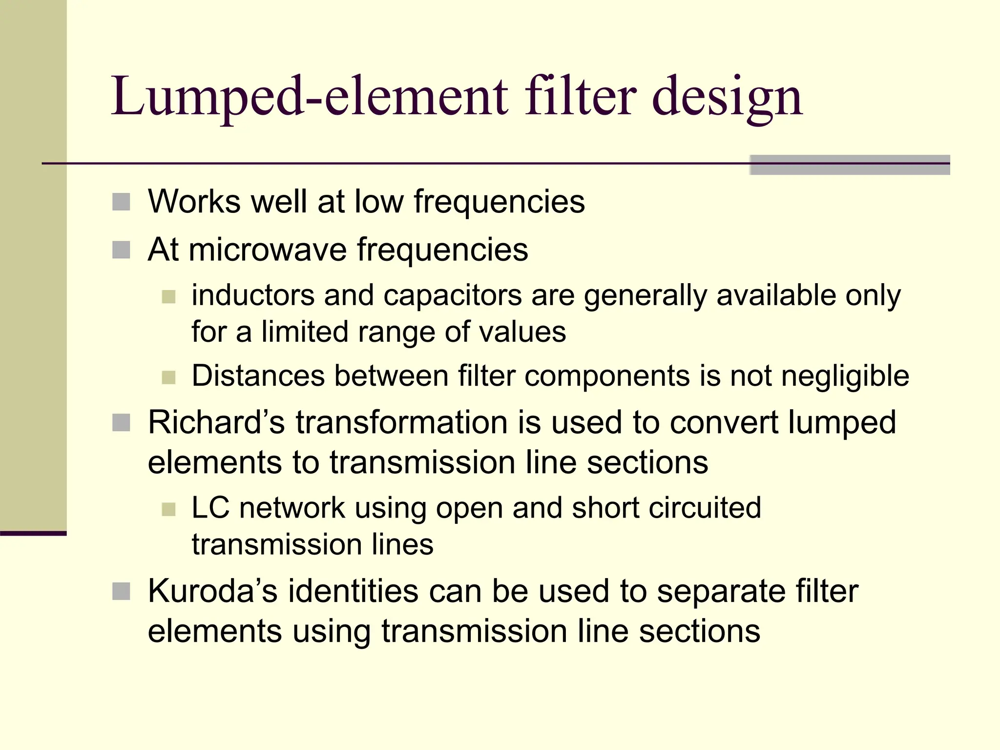 The document discusses Richard's transformation method for lumped-element filter design, emphasizing its application at low and microwave frequencies. It introduces Kuroda's identities for separating filter elements with transmission line sections and outlines specific filter design problems, including low-pass filters for various cut-off frequencies and impedances. The content covers key concepts in filter design, practical realizations, and transformation techniques for effective circuit implementation.