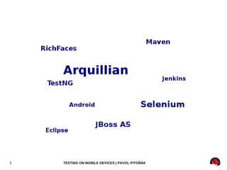 This document summarizes how to test Java web applications on mobile devices using Arquillian and Selenium. It describes setting up Android emulators, configuring the Arquillian extension for AndroidDriver, and writing sample unit and functional tests for a mobile web application using Page Object Model patterns and the WebDriver API. Tips are provided for debugging tests, capturing screenshots on failure, and integrating tests with Jenkins.