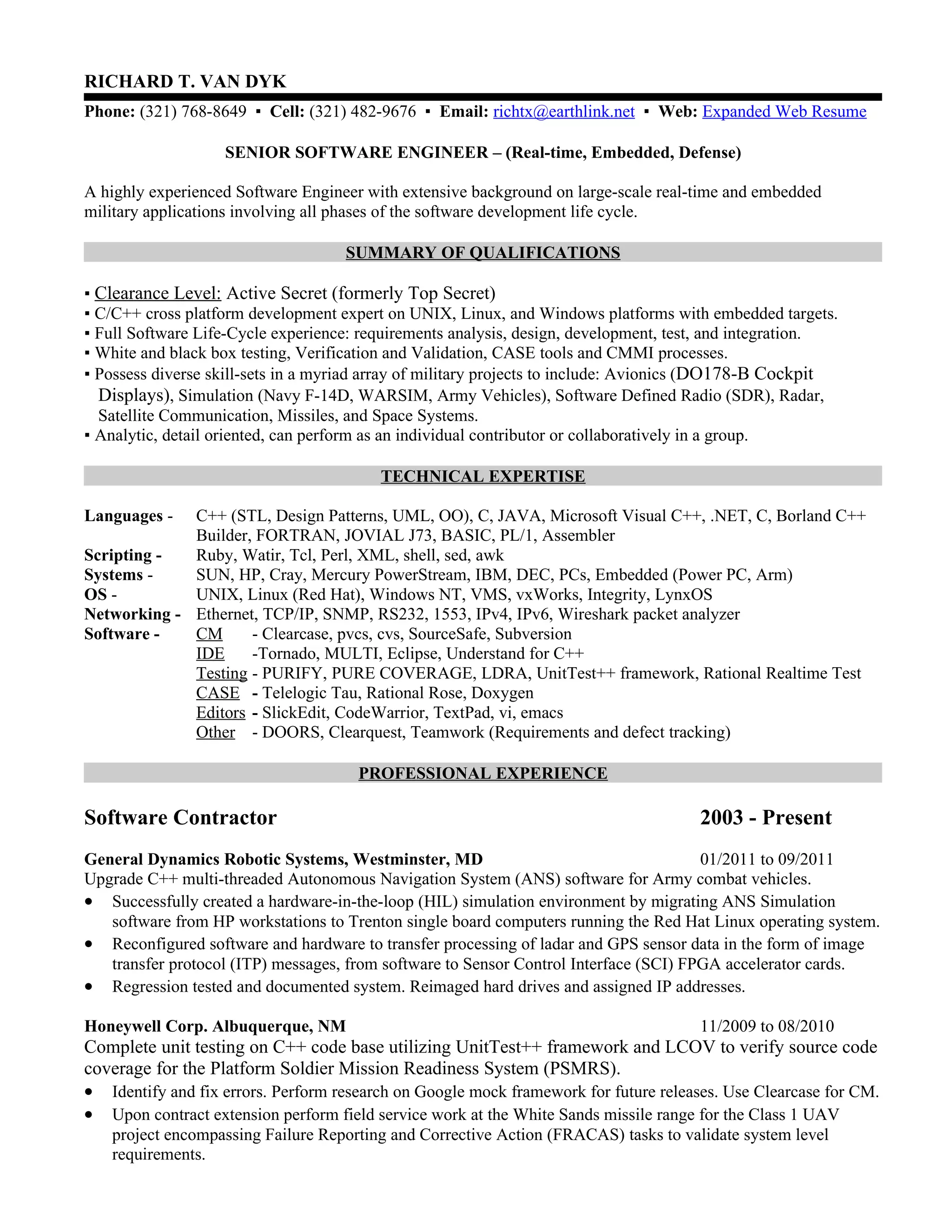 This document is a resume for Richard T. Van Dyk, a senior software engineer with experience developing software for Department of Defense applications. It summarizes his qualifications and extensive background developing real-time and embedded military software using languages like C++. It also lists his technical expertise, education, professional experience developing software for programs like avionics, simulation, software defined radio, and more.