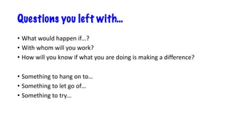 This document summarizes key points from a professional learning session on effective literacy practices for inclusive classrooms. It discusses strategies like building background knowledge, using visuals, focusing on meaning over isolated skills, and providing choice and relationships. Specific practices that support struggling readers are highlighted, like one-on-one support and conferencing. Questioning round-robin reading and skills in isolation, it advocates for high expectations, comprehensive instruction, and addressing students' individual needs.