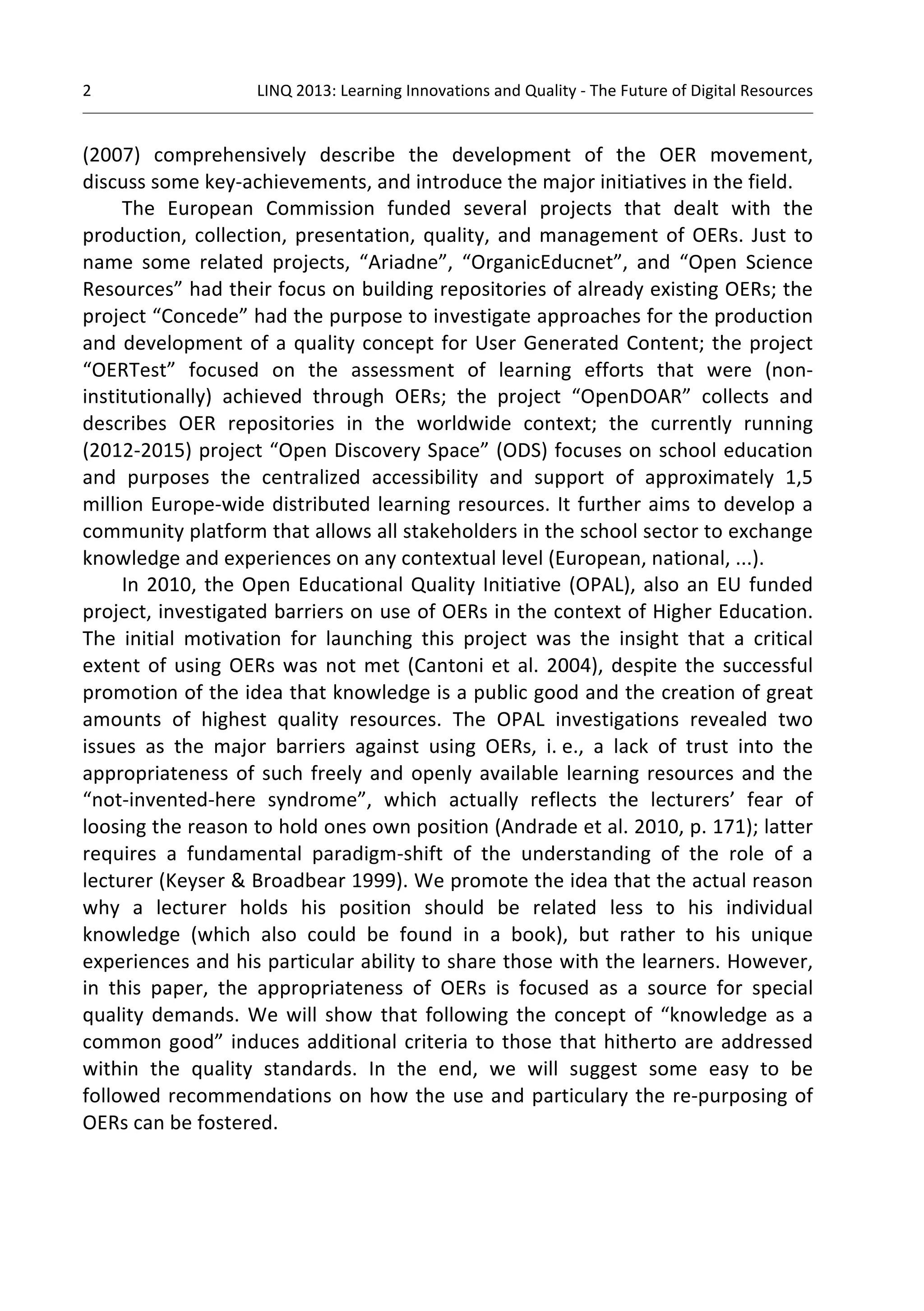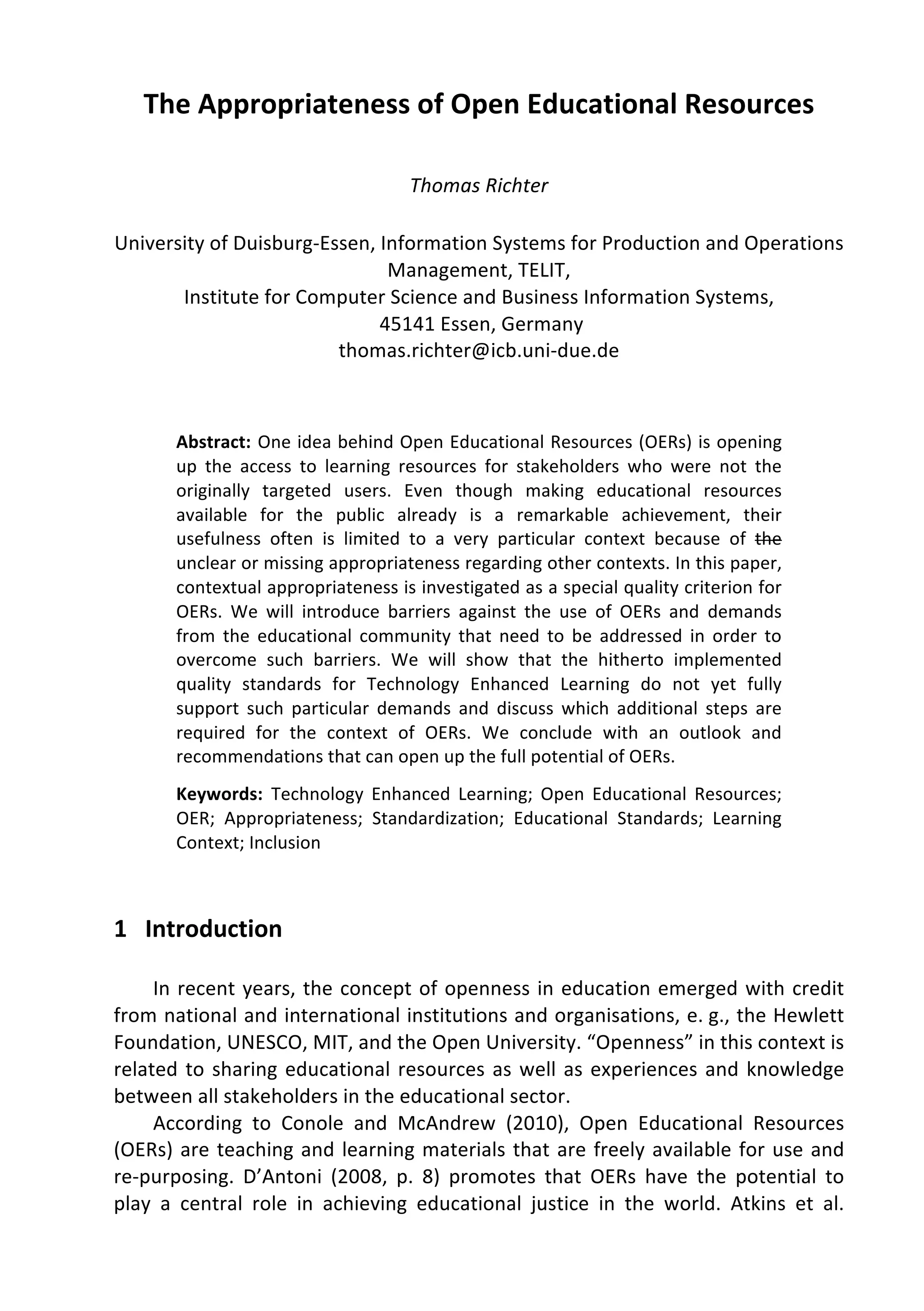 The paper investigates the appropriateness of Open Educational Resources (OERs) and their contextual adaptability, focusing on barriers to their use in education. It highlights that while OERs aim to provide accessible learning materials, their effectiveness often depends on individual educational contexts and the specific needs of users. The authors recommend mandatory declarations of adaptability and clearer quality standards to enhance the reusability of OERs across different contexts.