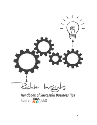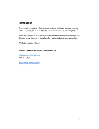 This book compiles insights from Robert Cornish, CEO of Richter, to help businesses improve their marketing effectiveness. Key themes include the importance of preparation, understanding the target public, and using engaging video trailers to drive response. The overarching goal is to equip businesses with strategies that foster growth and organization.
