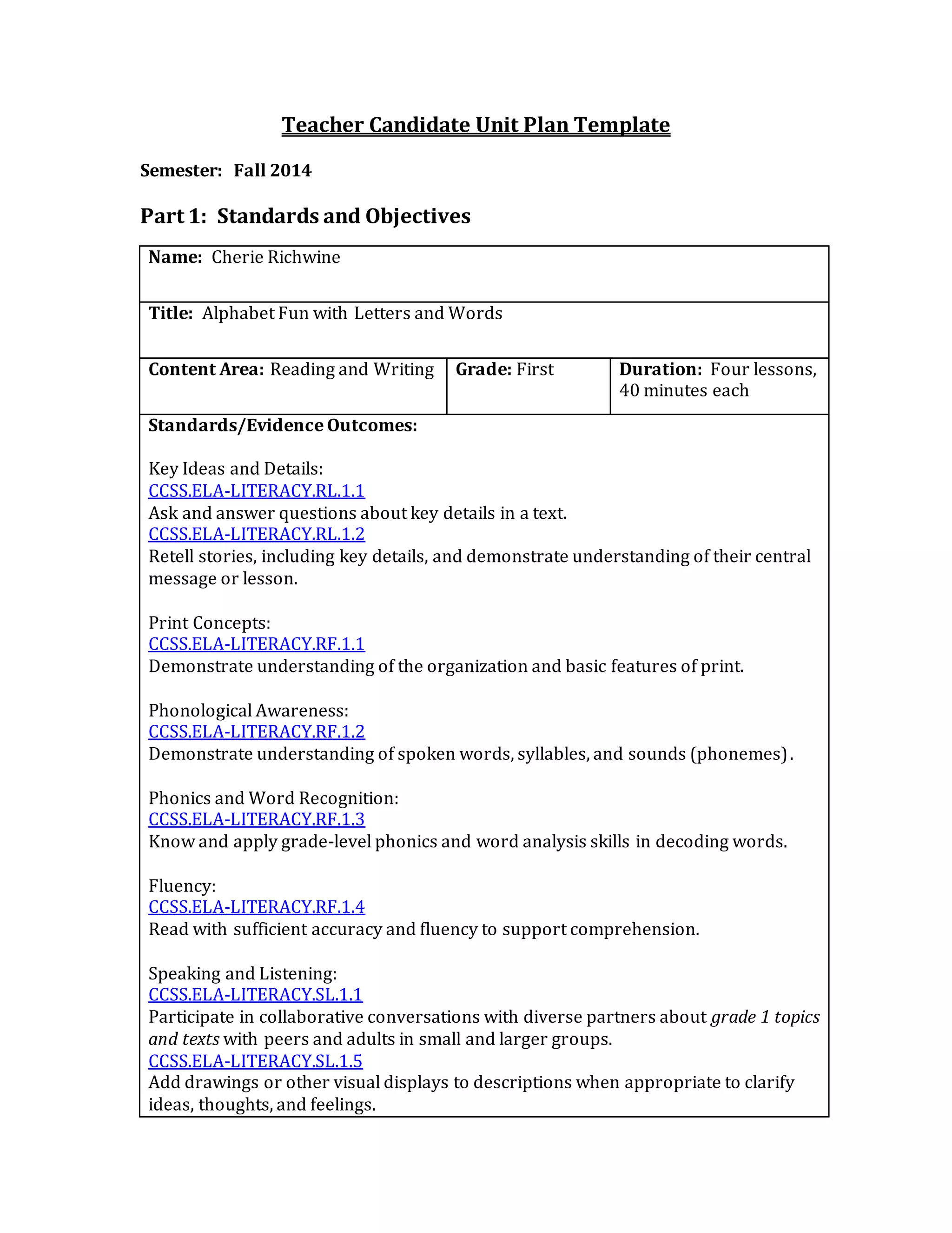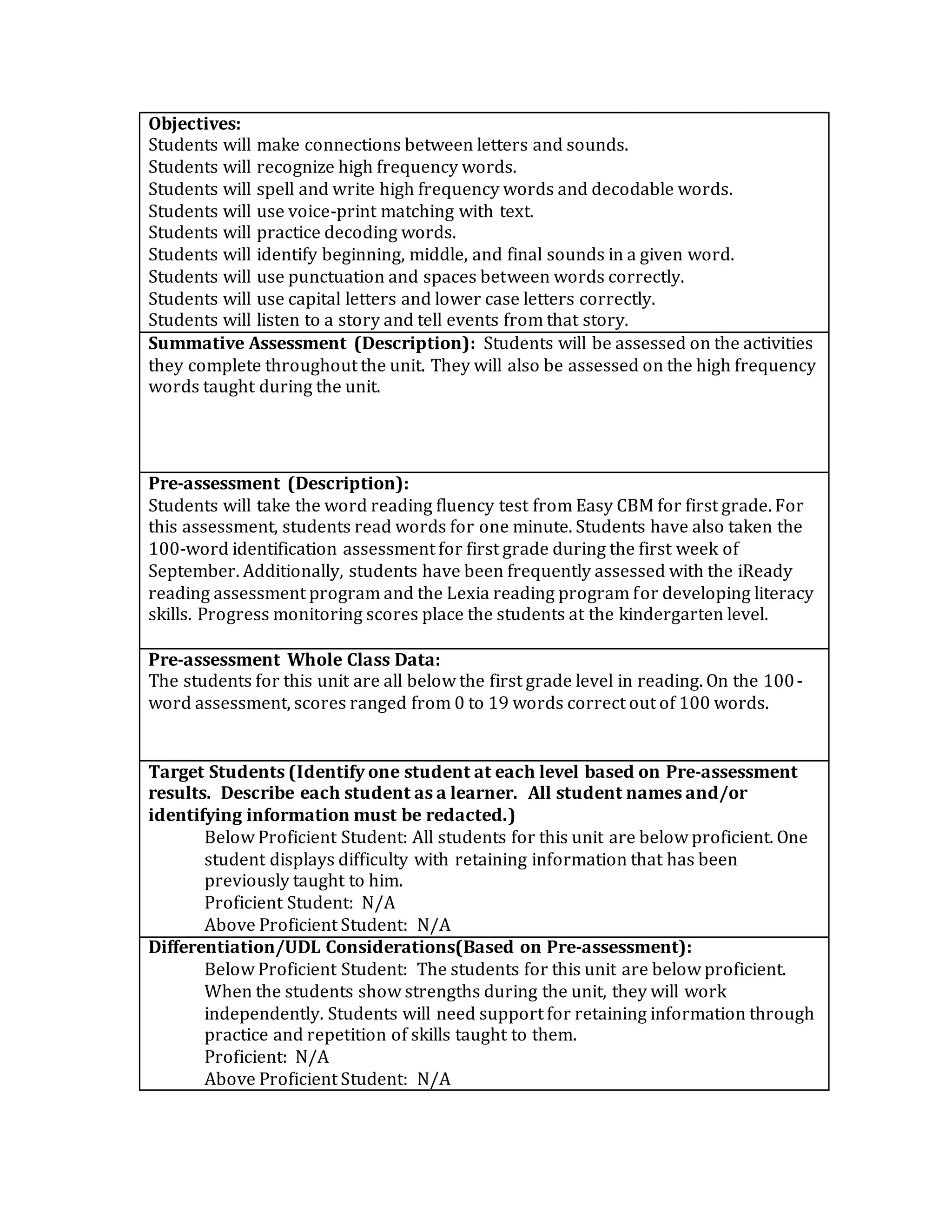 This unit plan was designed for a first grade reading and writing class to help students improve their literacy skills over four 40-minute lessons. Based on pre-assessments, all students were below the first grade level. The plan included activities to help students make letter-sound connections, recognize high frequency words, practice decoding, and develop fluency. Formative assessments during lessons and summative assessments after showed that most students' reading skills improved, though one student who missed the first lesson did not progress as much. The teacher reflected that interactive activities engaged students and supported learning, and collaborating more with classroom teachers could strengthen future units.