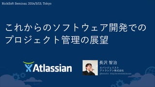 エバンジェリスト RickSoft Seminar, 2014/3/13, Tokyo これからのソフトウェア開発での プロジェクト管理の展望 Twitter: @tomohn Mail: tnagasawa@atlassian.com Blog: re-workstyle.com ご清聴、まことにありがとうございました。 講演 / 執筆 のご依頼は、お気軽にお申し付けください。