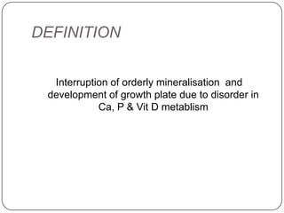 Rickets and osteomalacia are disorders caused by interrupted mineralization of bone due to calcium, phosphorus, and vitamin D metabolism issues. Rickets occurs in children and causes bone deformities, while osteomalacia occurs in adults. Various types of rickets include vitamin D deficiency, vitamin D dependent, and vitamin D resistant. Treatment involves vitamin D supplementation, calcium supplementation, and correcting fluid and electrolyte imbalances. Osteomalacia in adults is also caused by vitamin D deficiency and is treated with vitamin D supplementation.