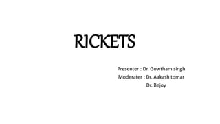 - Symptoms include bone deformities, muscle weakness, and fractures. Diagnosis involves blood tests showing low vitamin D and elevated alkaline phosphatase. Treatment is vitamin D supplementation.