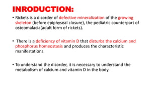 - It is a disorder of defective bone mineralization caused by vitamin D deficiency that disturbs calcium and phosphorus homeostasis.