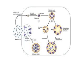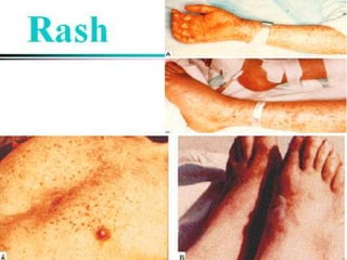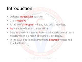Rickettsia are obligate intracellular parasites that infect arthropods like ticks and mites. They are transmitted to humans via arthropod bites and infect endothelial cells. This causes thrombosis and occlusion of blood vessels, leading to organ damage and acute febrile illness with rash. Some examples include: Rocky Mountain spotted fever caused by R. rickettsii transmitted by ticks; and epidemic typhus caused by R. prowazekii transmitted by body lice. Diagnosis involves microscopy, culture in animals or cells, and serological tests like Weil-Felix and immunofluorescence. Treatment is with doxycycline or tetracycline.