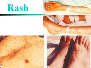 This document summarizes rickettsial diseases, which are caused by obligate intracellular parasites called Rickettsia. Rickettsia species are transmitted to humans via the bites of infected arthropods like fleas, lice, ticks and mites. Some key Rickettsia species and the diseases they cause include R. prowazekii which causes epidemic typhus, R. typhi which causes endemic typhus, and R. rickettsii which causes Rocky Mountain spotted fever. Symptoms include fever, headache, rash and potentially serious complications if left untreated. Diagnosis involves isolation of the bacteria or serological tests to detect antibodies. Treatment is with doxycycline or tetracycline.