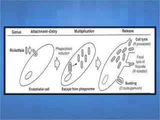 Rickettsial diseases, including Rocky Mountain spotted fever and typhus, are caused by obligate intracellular parasites transmitted through arthropod vectors like ticks, fleas, and lice. Symptoms typically include fever, severe headache, and skin rash, while diagnosis relies on serologic assays and clinical suspicion. Treatment with doxycycline is effective, and preventive measures focus on limiting exposure to ticks.